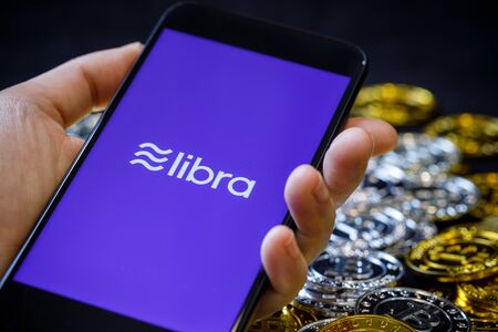 Bangkok, Thailand - July 2, 2019: Phone shows Libra logo on the screen. Facebook reported to utilize new cryptocurrency called Libra. Libra was reported to be used for purchases in Facebook and other.