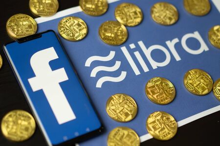 Bangkok, Thailand - July 2, 2019: Phone with Facebook logo on screen is placed on paper with Libra logo. Facebook reported to utilize new cryptocurrency called Libra expected to be used on Facebook.
