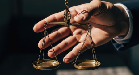 Close-up view of hands holding traditional brass scales of justice, symbolizing fairness and balance in legal matters, representing the principle of equality.