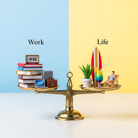 Work life balance concept shown on antique scale, heavy books versus relaxing vacation items, contrasting choices.