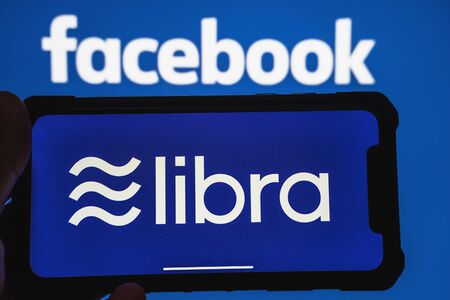 Moscow, Russia - Circa August 2019 : Libra - text on screen of Iphone and blurred text Facebook on background. New cryptocurrency concept.