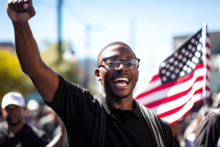 A determined African American man in front of USA flag among the crowd, proud and confident, fighting and protesting with a raised fist against racism, for justice and equality, Black Lives Matter