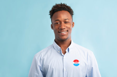 Young African American man shows his support for democracy with a 'vote' badge. He proudly displays this badge, encouraging civic participation.