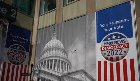 NEW YORK - JULY 21, 2022: Fox News Channel at the News Corporation headquarters building in New York City. News Corporation is an American diversified multinational mass media corp