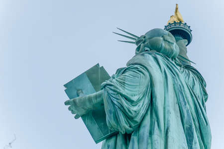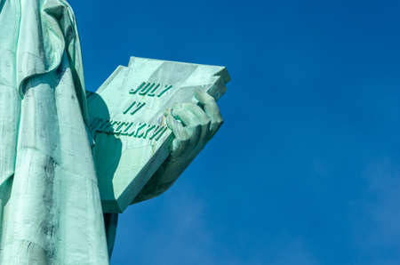 Detail of Statue of Liberty against blue sky, book with the date of USA's independence. New York City, United States.