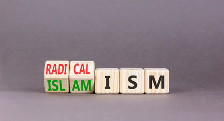 Islamism or radicalism symbol. Concept words Islamism or Radicalism on beautiful wooden cubes. Beautiful gray table gray background. Business islamism or radicalism concept. Copy space