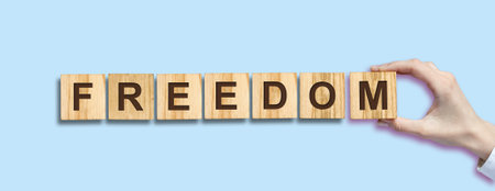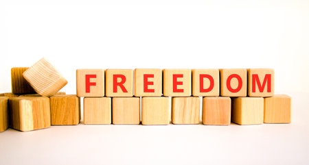 Freedom support symbol. Concept word Freedom on beautiful wooden blocks. Beautiful white background. Business freedom support concept. Copy space.