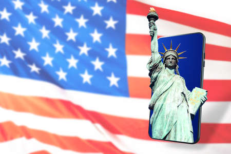 United States of America. The American flag and the Statue of Liberty. Democracy and freedom. The Statue of Liberty on the smartphone screen. Symbols of the American state.