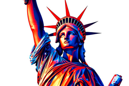 Statue of liberty with an American flag flying in the background. The concept of democracy and freedom, the Fourth of July holiday Independence Day in the United States. Generative AI.