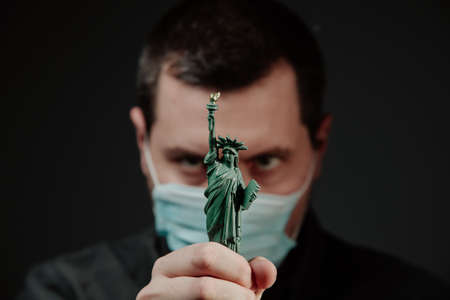 white young man in a medical mask, on a dark background, holds in his hand the figure of the article of freedom. Coronavirus in the United States.
