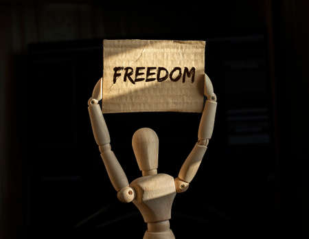 freedom inscription on poster of abstract wooden protester.
