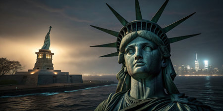 Damaged Statue of Liberty on stormy background
