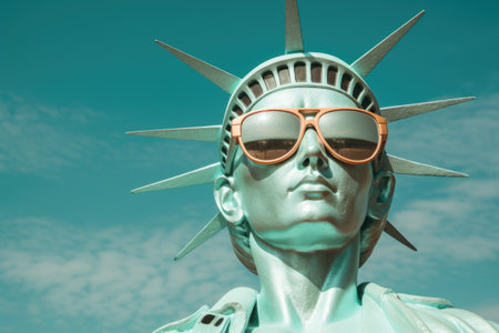 Statue of liberty wearing fancy sunglasses against a blue sky.