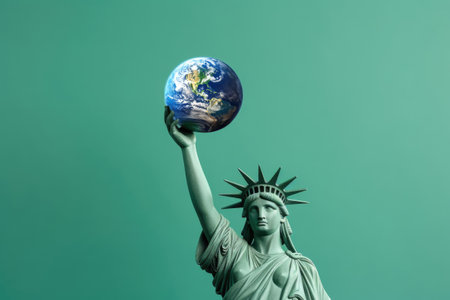 Statue of Liberty with the Earth in her hands on a blue background. Earth Day Concept.