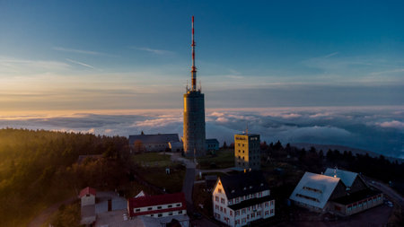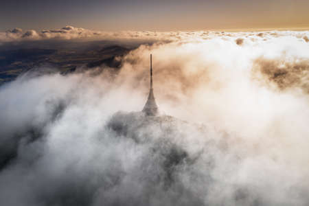 LIBEREC, CZECH REPUBLIC - JUNE 02, 2021: Jested Mountain Hotel and TV transmitter above Liberec, Czech Republic. Aerial view from drone