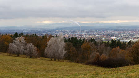 City Ceske Budejovice from hill Dubicne with freeze autumn trees and overcast sky. Czech republic