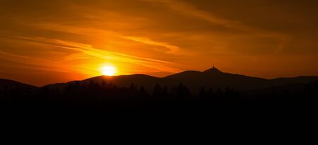 Silhouette of Jested mountain at sunset time, Liberec, Czech Republic.