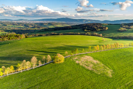 Beautiful view of a typical kneeling on the peaks in Hruby Jesenik, North Moravia, Czech Republic. Morning view of the villages of Mala Moravka and Karlov pod Pradedem. Typical Czech landscape. Green and blue.