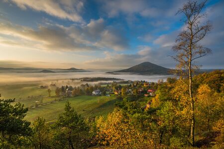 Ralsko Mountain rising from the mist. Weather temperature inversion in Central Bohemian Uplands, Czech Republic.