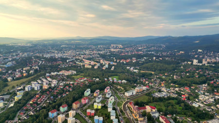 This breathtaking aerial view beautifully showcases a tranquil town landscape bathed in warm golden hour light