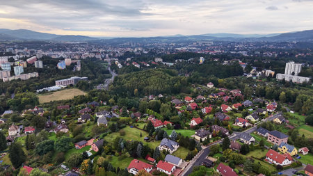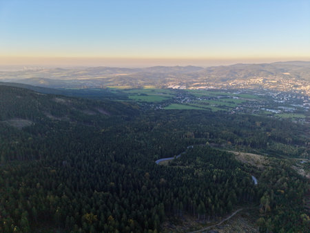 Sunrise sunse over the city of Liberec, Czech republic. Jested. View from the view Prosec, Jested Mountain. Jizerske mountains and Liberec.