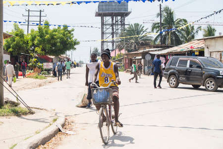 OUIDAH, BENIN - Jan 10, 2017: Unidentified Beninese man in colored shirt frowns at the local market. Benin people suffer of poverty due to the bad economy