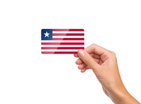 Beautiful hand holding Liberia flag card on white background