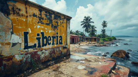 A weathered building with the word 'Liberia' stretches along a littered coastal shore, under a bright sky, flanked by palm trees and the ocean.