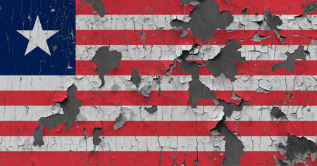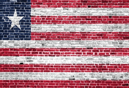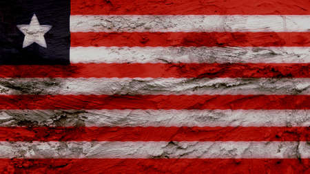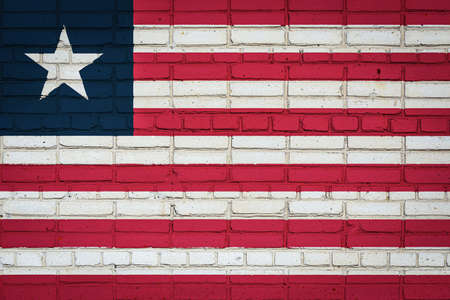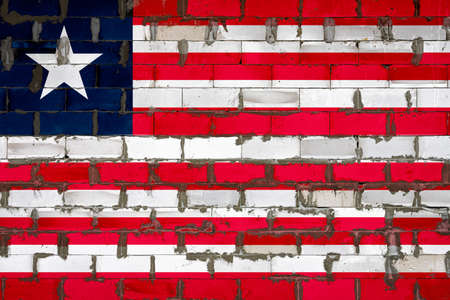 National flag of Liberia depicting in paint colors on an old brick wall. Flag banner on brick wall background.