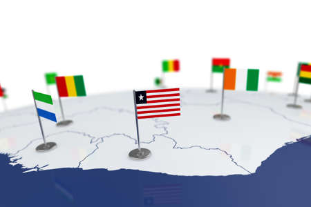Liberia flag. Country flag with chrome flagpole on the world map with neighbors countries borders. 3d illustration rendering