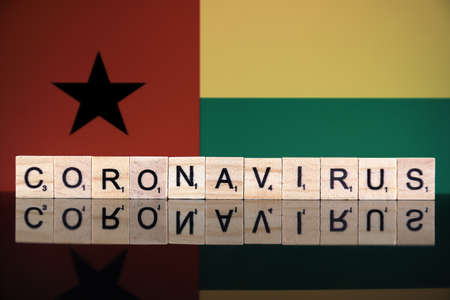 WROCLAW, POLAND - MARCH 28, 2020: Word CORONAVIRUS made of wooden letters, and Guinea Bissau Flag in the background. Coronavirus (COVID-19) global disease 2020.