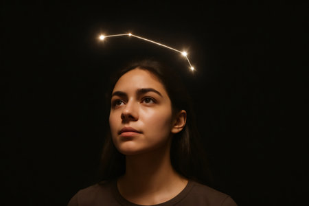 Studio portrait of a young woman with the Aries constellation shining above her, symbolizing astrology, dreams, and destiny