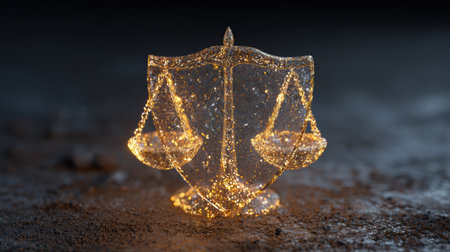 A glowing shield shape with scales symbolizing justice and legal protection, placed on a neutral surface in soft light.
