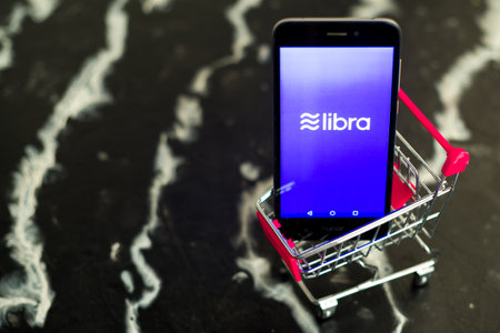 Tula, Russia - 4 July 2019 : Libra coin blockchain concept with smartphone on shopping cart on dark desk. New project libra a cryptocurrency launched by Facebook looks to mainstream digital currency