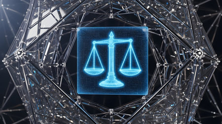 In a neon-lit future, the classic scales of justice weigh traditional legal principles against the immense power of digital data.