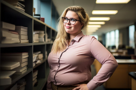 lovely beautiful woman with library in background, generative AI
