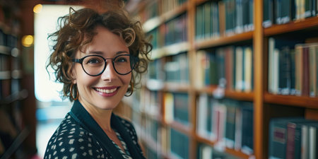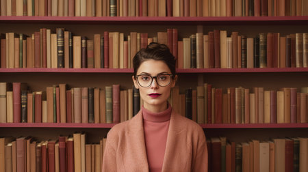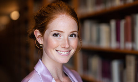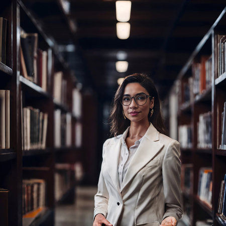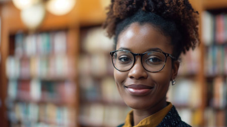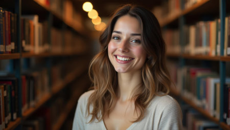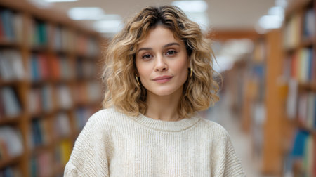 A young woman stands in a library, exuding confidence and curiosity. Her wavy hair frames her face as she poses warmly amid rows of books, embodying a love for learning.