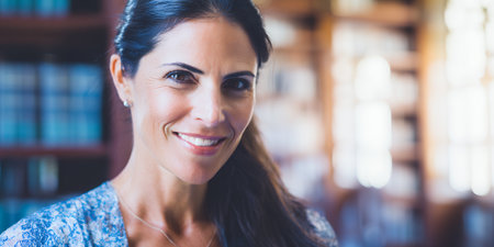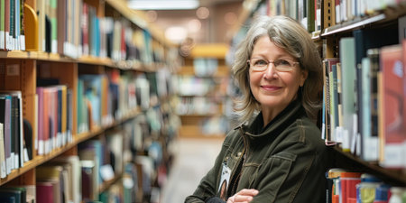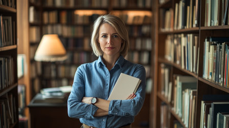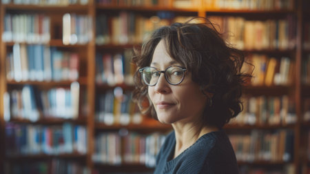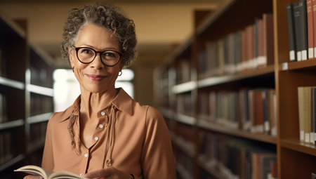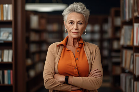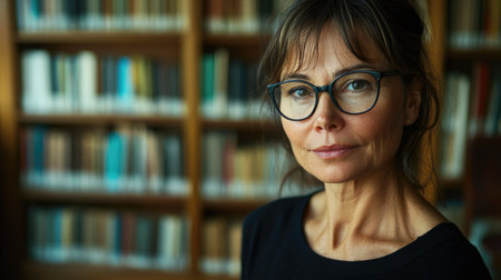 Portrait of mature woman standing in library and looking at camera.