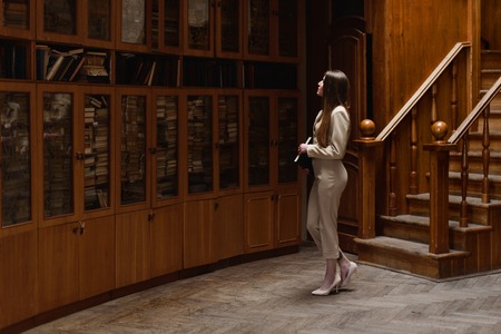 Beautiful stylish lady choose book to read. Vintage library.