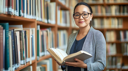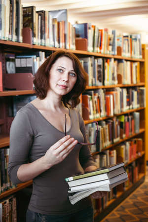 Portrait of middle age mature brunette Caucasian woman student with glasses in library holding book, looking directly in camera, teacher librarian profession, back to school concept