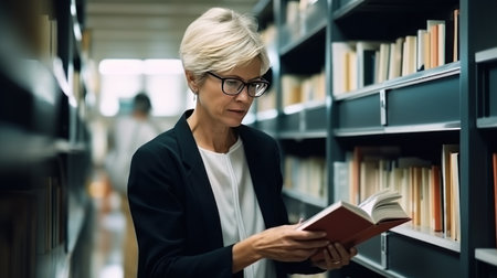 Caucasian woman teacher with glasses studies material in textbook standing near shelves in library. Lady professor at university gains knowledge from book. Personality improvement at middle age