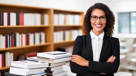 beautiful african american black woman with library in background, generative AI