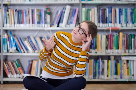 Young pensive attractive woman with glasses in formal clothes reading a book at library.
