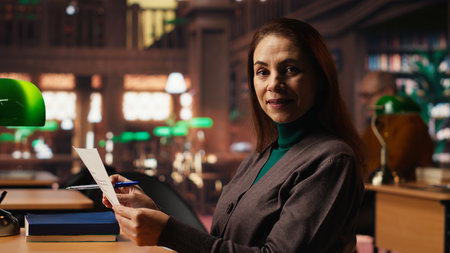 Woman with a serious expression studies papers at a public library desk, engaged in academic research and reading textbooks to enrich her understanding of literature. Self study.