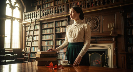 Captivating portrait of a young woman in vintage attire, poised amidst a vast collection of antique books in an elegant library setting.