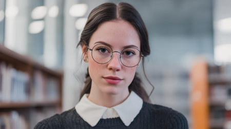 A young woman with freckles and glasses looks directly at the camera in a library setting.