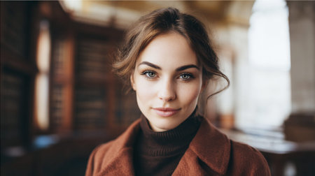 A young woman with striking green eyes and light brown hair, wearing a brown turtleneck and a matching coat, looks directly at the camera with a gentle smile. The background suggests an indoor setting, possibly a library or study, with blurred bookshelves adding depth to the portrait.