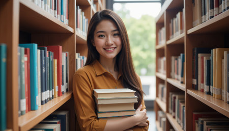 Young woman in library holding books, smiling amidst bookshelves.