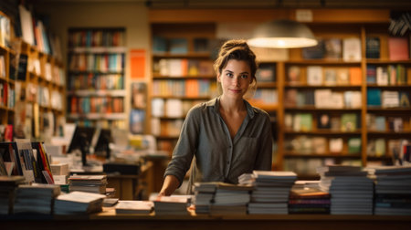 Bookstore cashier recommends titles surrounded by shelves of books