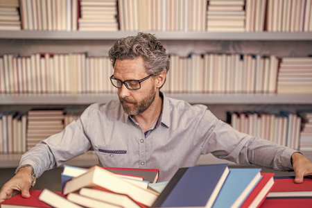 school education in college. overwork of bookworm. teacher genius in school library. genius studying homework literature near pile of books. man teacher read book. research education and discovery